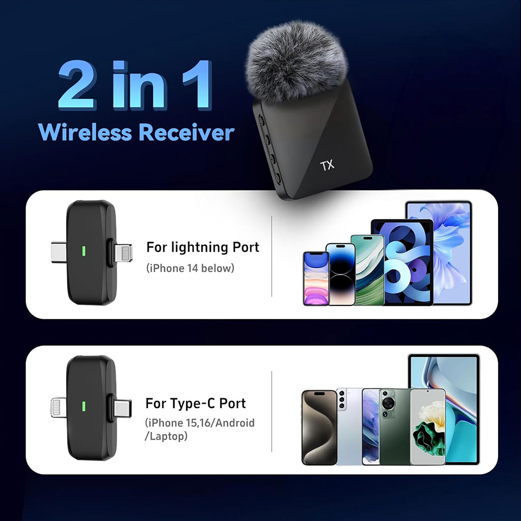 Microphone Sans Fil Professionnel 2en1 pour iPhone et Android F15 – ميكروفون لاسلكي متعدد المنافذ