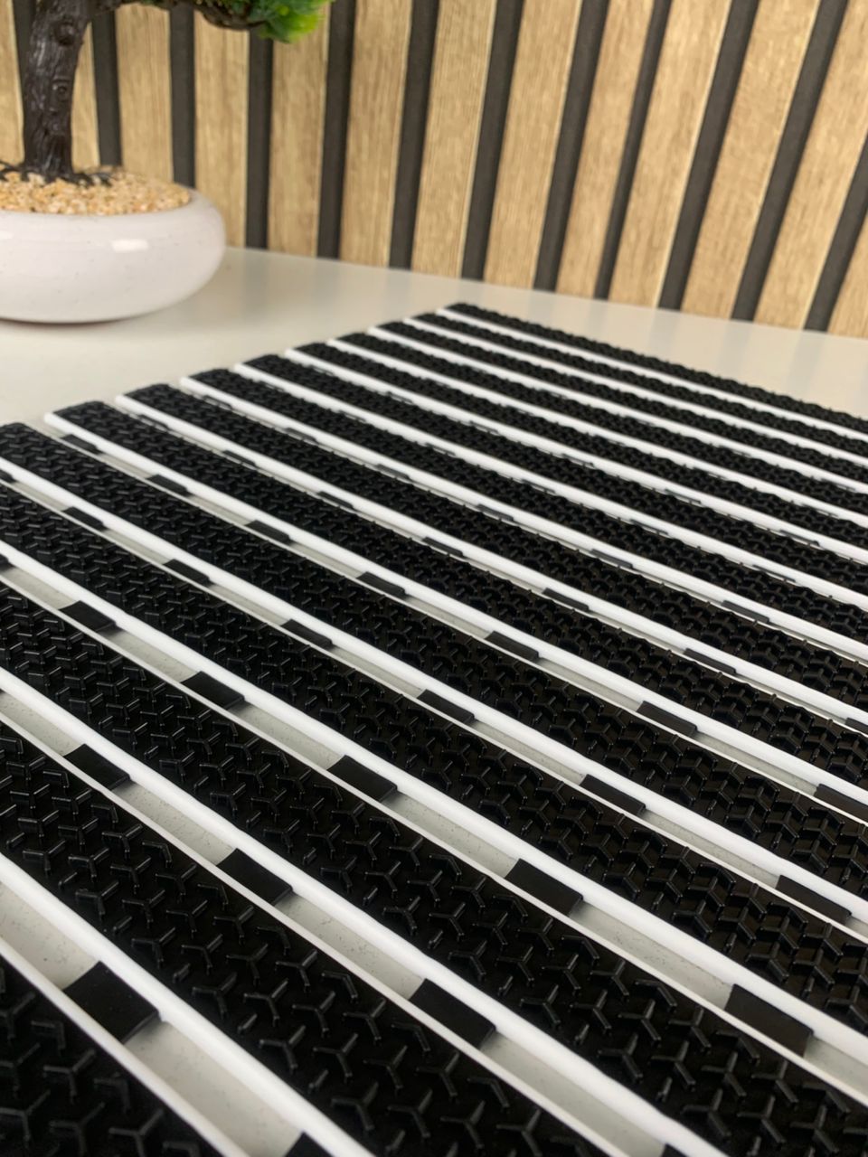 تتميز الحصيرة بتصميم مخطط عصري وأنيق، لا يضيف لمسة جمالية فقط، بل يعزز أيضًا قوة التماسك ويقلل من خطر الانزلاق، مما يوفر حماية أفضل لجميع أفراد العائلة.