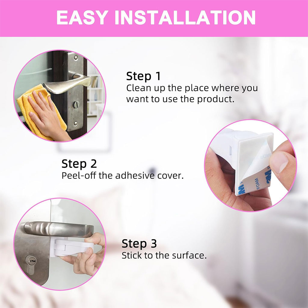 قفل أمان الأطفال سهل التثبيت دون الحاجة إلى الحفر أو البراغي. يكفي تنظيف سطح الباب جيدًا ثم لصق القفل أسفل المقبض بكل بساطة.