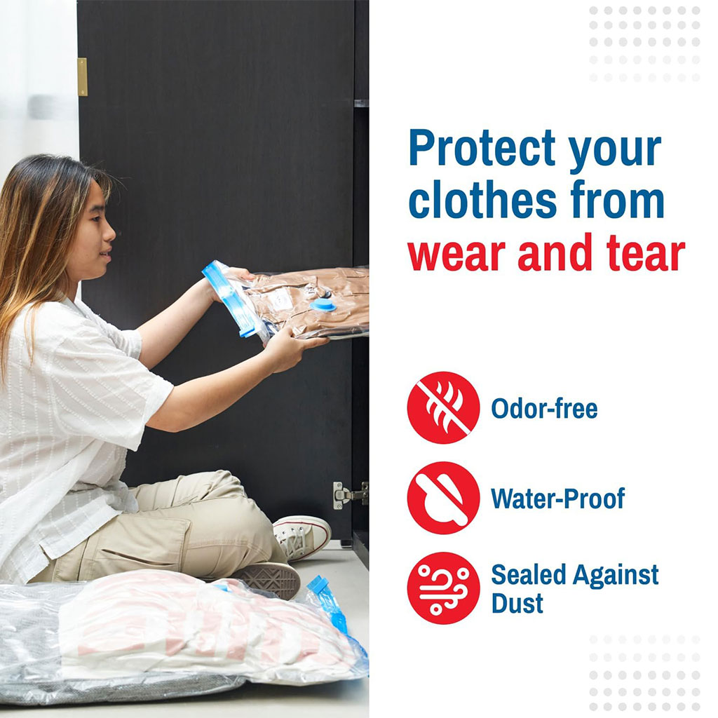مع مجموعة الأكياس المفرغة من الهواء (Vacuum Bags)، أصبح تنظيم منزلك وتوفير المساحة أسهل من أي وقت مضى. مثالية لترتيب الخزائن، حماية الملابس من الغبار، أو التحضير للسفر والعطل! 🏠✈️